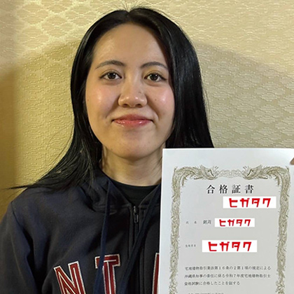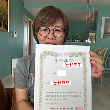 佐久川さん(宮古校) 宮古島に帰省した際に身近な人達の不動産取引について何件も見聞きしたことで宅建士に興味を持ちました。 独学での合格は無理だと思い、試験合格に向けた課程がしっかりしている比嘉不動産宅建塾に申し込むことを決めました。 9月下旬から宅建士試験当日までの追い込み・詰め込みが辛く精神的に疲れました。 宅建塾では、試験までの勉強方法と試験中の対策について詳しく教えてくれたのでストレスはだいぶ軽減できました。試験に合格できたことは精神面のサポートが一番大きかったです。 合格全額返金は、宅建士の資格登録費と渡航費そして応援してもらった家族に使います。 今後はフリーランスの宅建士として働けるよう必要な実務を経験し、将来は不動産取引で困っている人の手助けができればと考えています。 宅建士試験までの不安のなかサポートしていただきありがとうございました。宅建士試験に合格できたのは宅建塾の指導、環境、サポートのおかげです。宅建塾で学んだことを不動産関係の仕事や他の分野へ応用し取り組んでいきます。 比嘉さんをはじめスタッフさんにはたくさんお世話になりました。 今後ともよろしくお願いします。