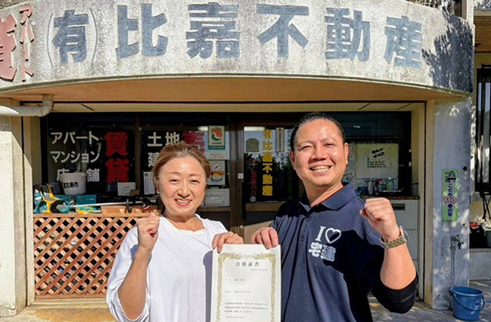 ⽐嘉不動産宅建塾那覇校で勉強させていただき、令和元年度宅地建物取引⼠資格試験に合格することができました。3度⽬の挑戦での合格となります。(⽐嘉不動産達宅建塾では 1年⽬)